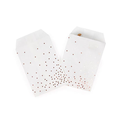 Reguliere prijs €26,40Eenheid prijs /Niet beschikbaarNabesteldPaper Zakken Wit Met Rose Goude Stippen Bedrukking 127x203mm - 100 st