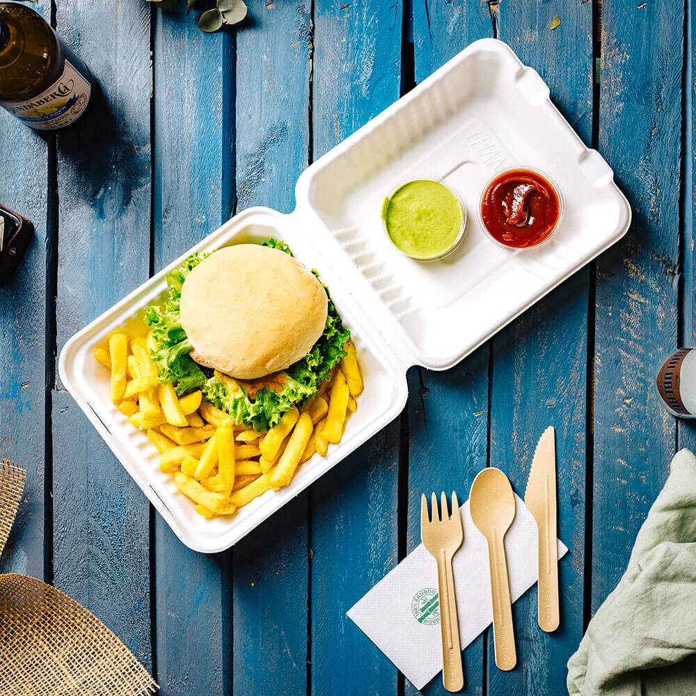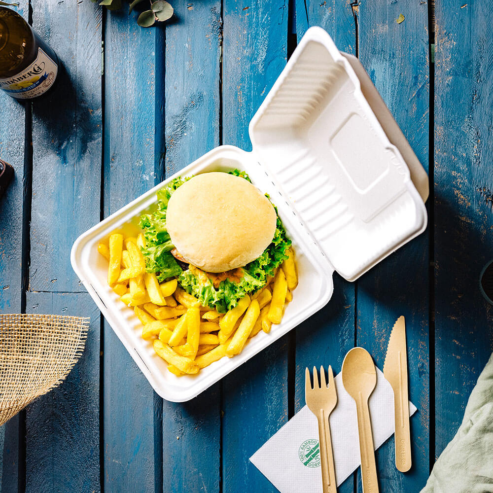 Take-away in robuuste bakjes: De bakjes zijn bijzonder geschikt voor fastfood en fingerfood. Zelfs vette gerechten zoals gebakken dumplings kunnen veilig worden verpakt. Omdat de bakken gemaakt zijn van suikerriet zijn ze van zichzelf al robuust en hebben hierdoor geen extra bescherming nodig doormiddel van een coating.